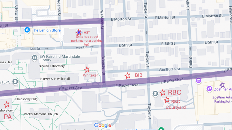 Note: Parking on main campus is not free at all. We recommend street parking (3 hr max parking), Zoellner lot ($1 an hour), and the New street garage ($12 a day; off-campus about 3-5 minute walk from HST).