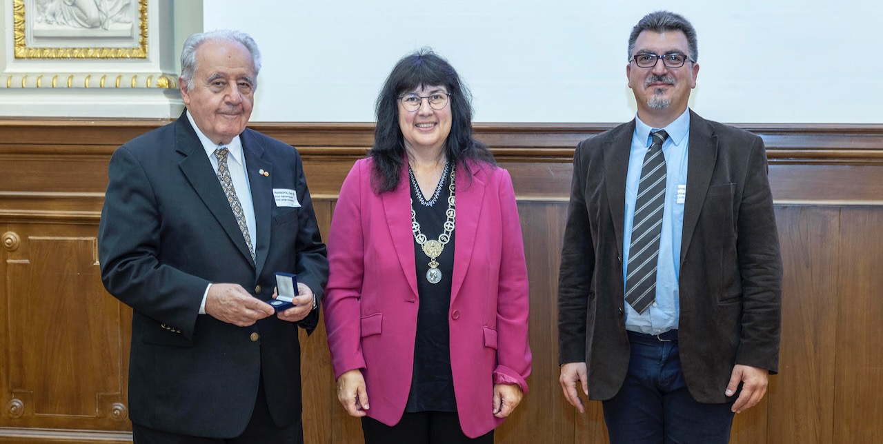 From left: Prof. Dan M. Frangopol is honored for his research contributions with the University of Rostock's commemorative medal, presented by the university’s rector, Prof. Elizabeth Prommer, and Prof. Panagiotis Spyridis, host of the 21st International Probabilistic Workshop. (Photo: Thomas Rahr, University of Rostock)