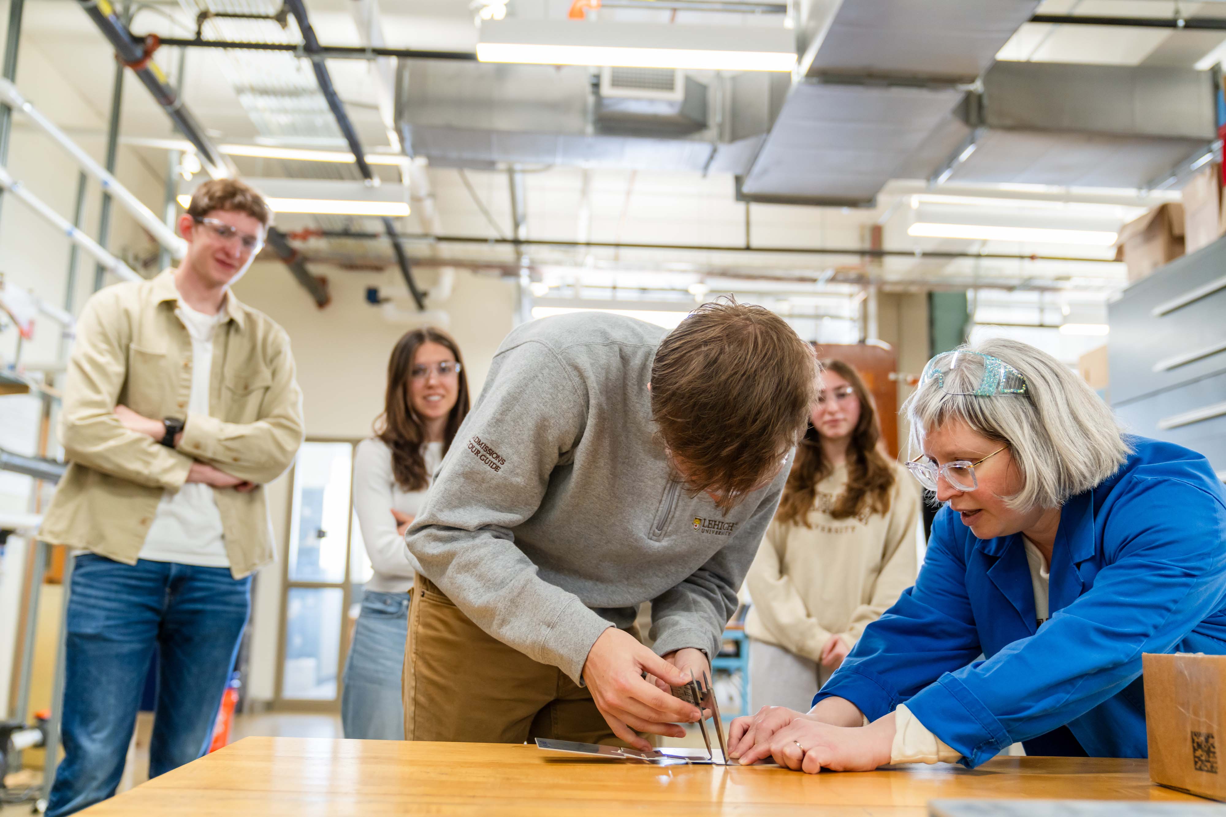 : MechE Associate Professor Natasha Vermaak with some of her MECH 003 students testing the auxetics to failure.