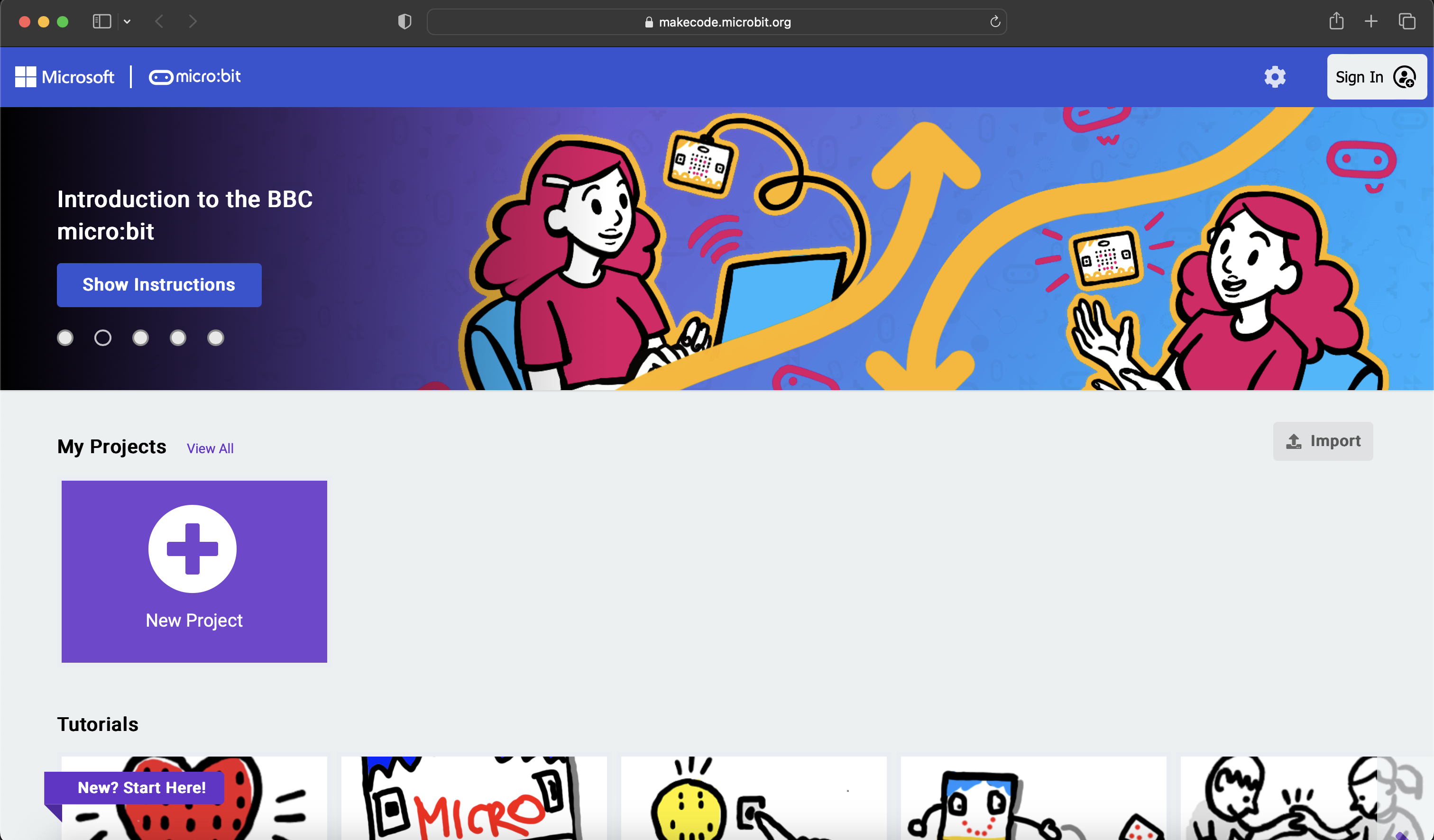 - Navigate to Microsoft MakeCode where you will be directed onto the home page, as shown below. NOTE: you are not required to login or create an account to interact with this resource.