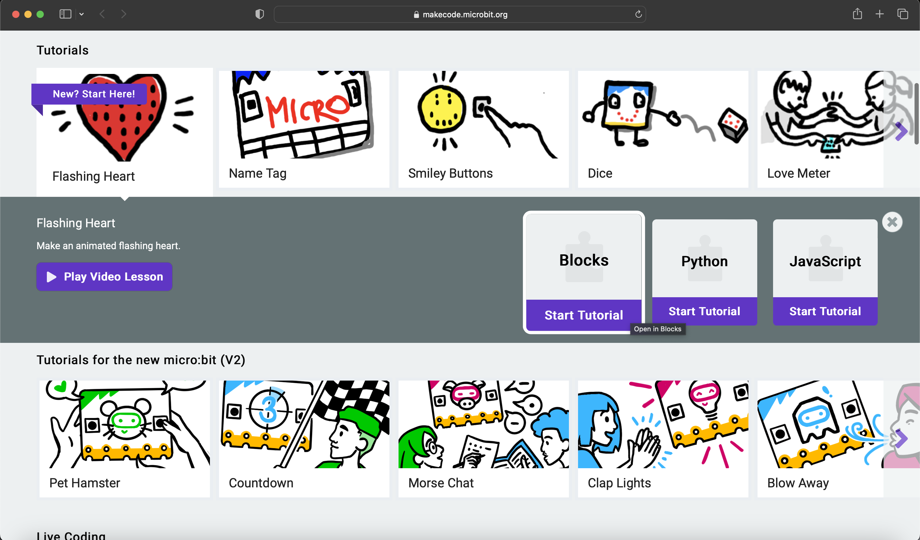 - Locate the “Flashing Heart” tutorial and click on “Start Tutorial” on the “Blocks” option.