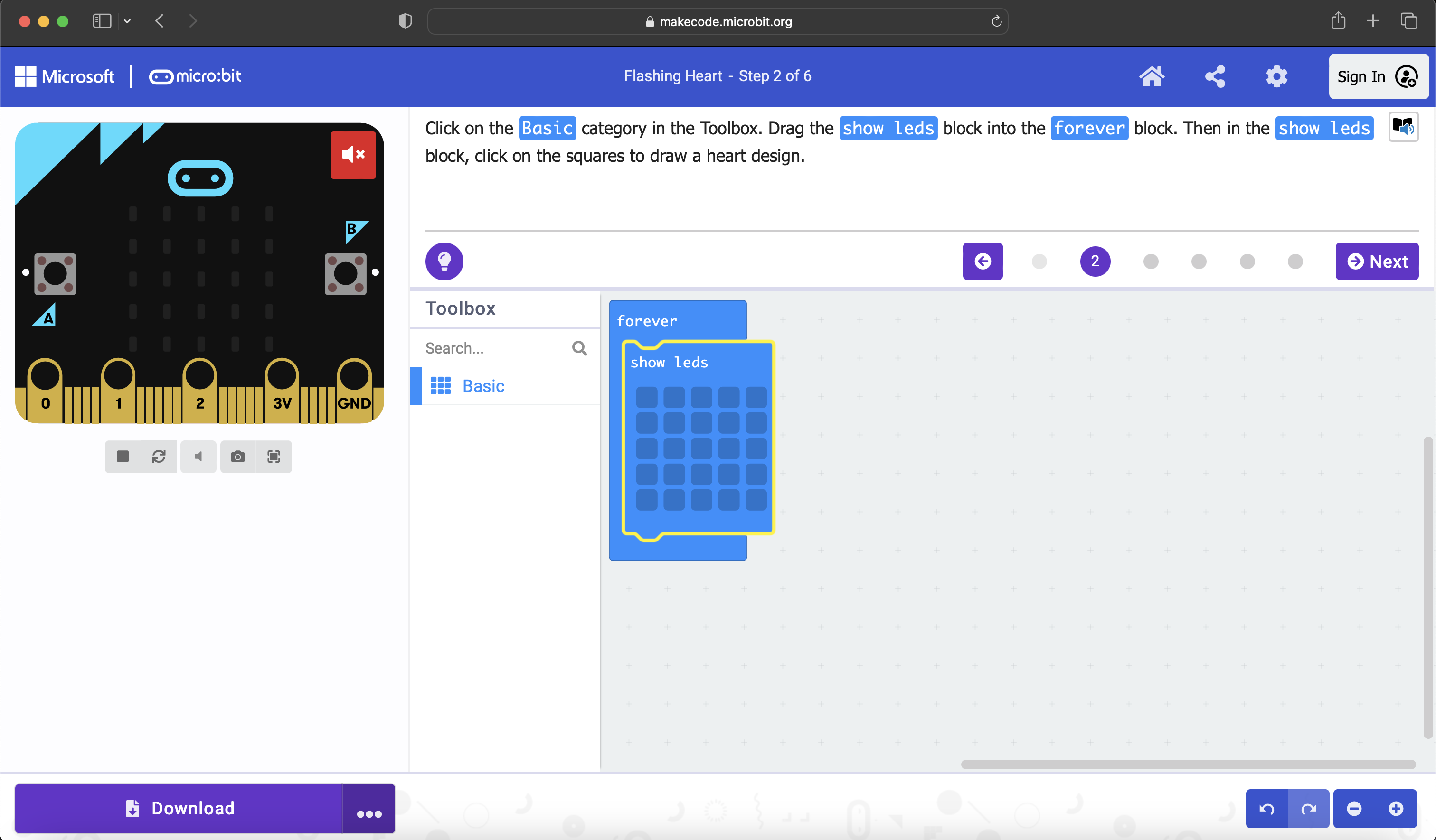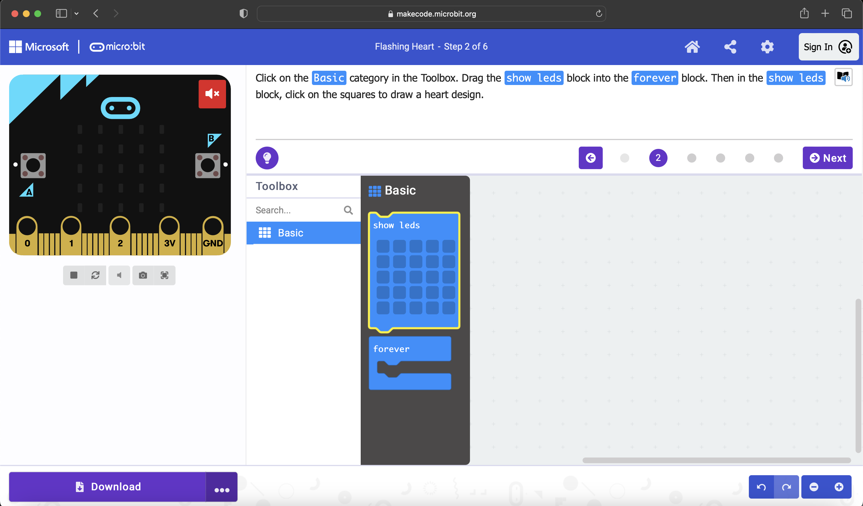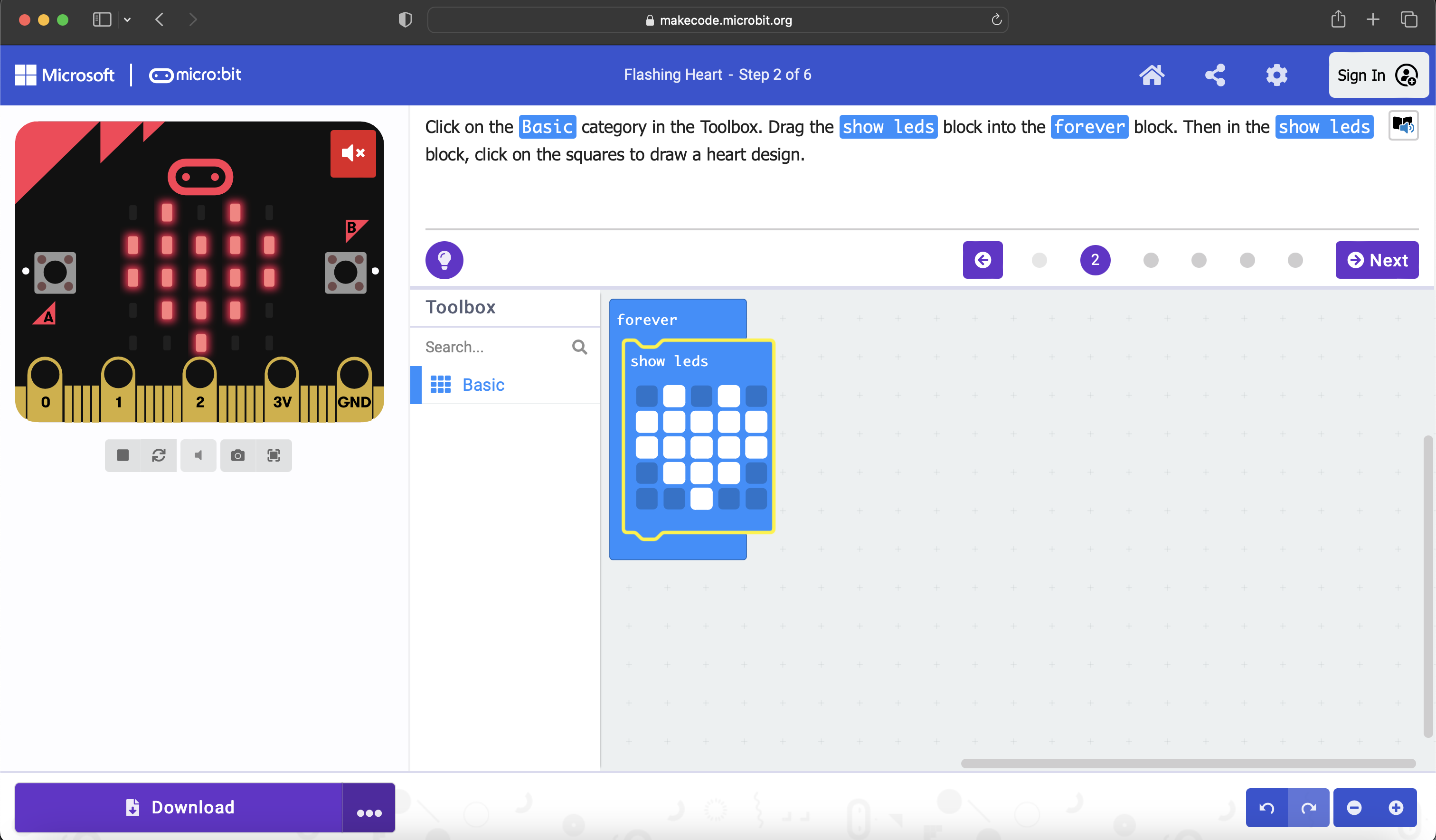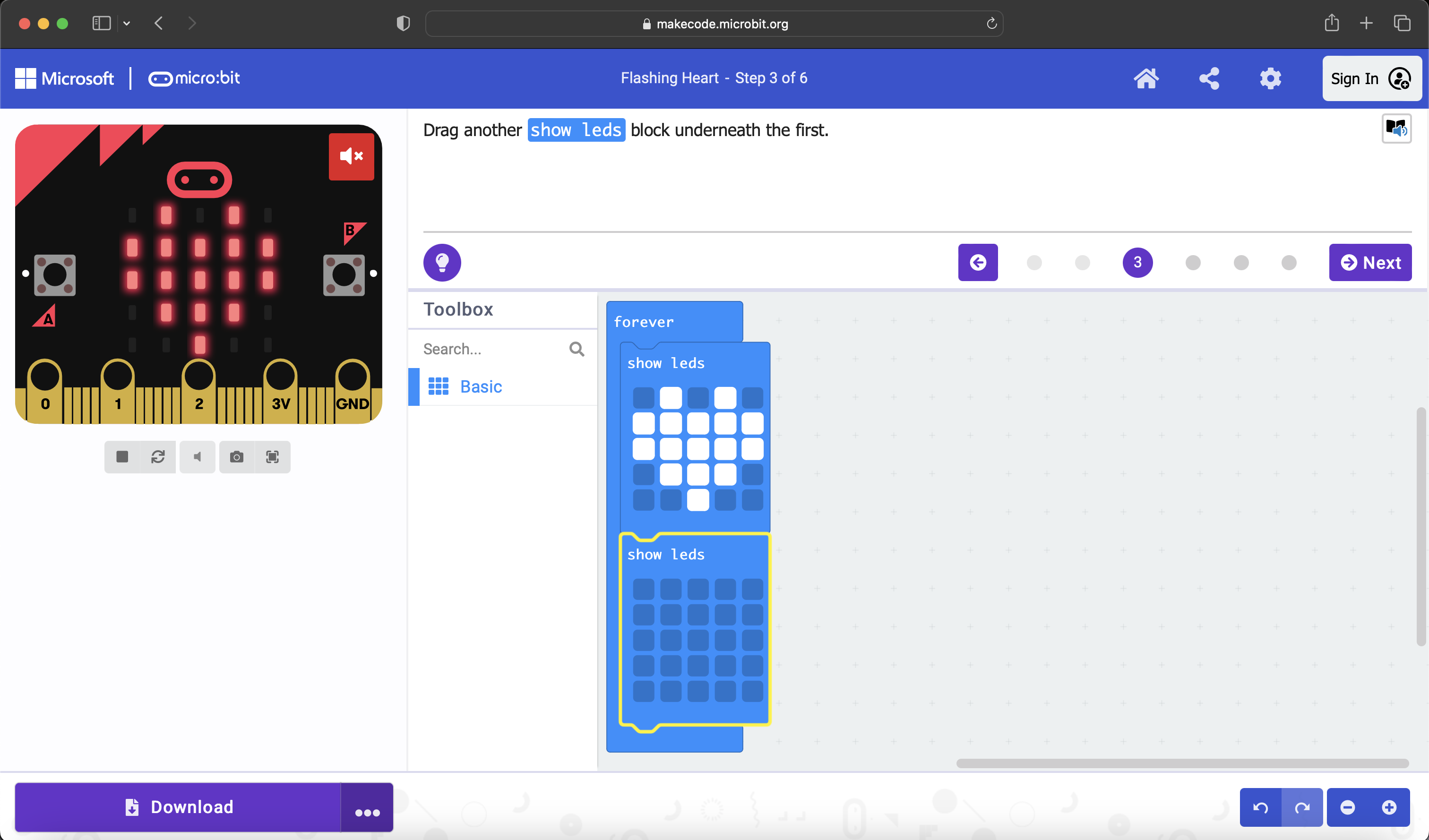 - Once the Flashing Heart - Blocks tutorial page loads, follow the directions at the top of the screen: Click on the Basic category in the Toolbox... (see below)