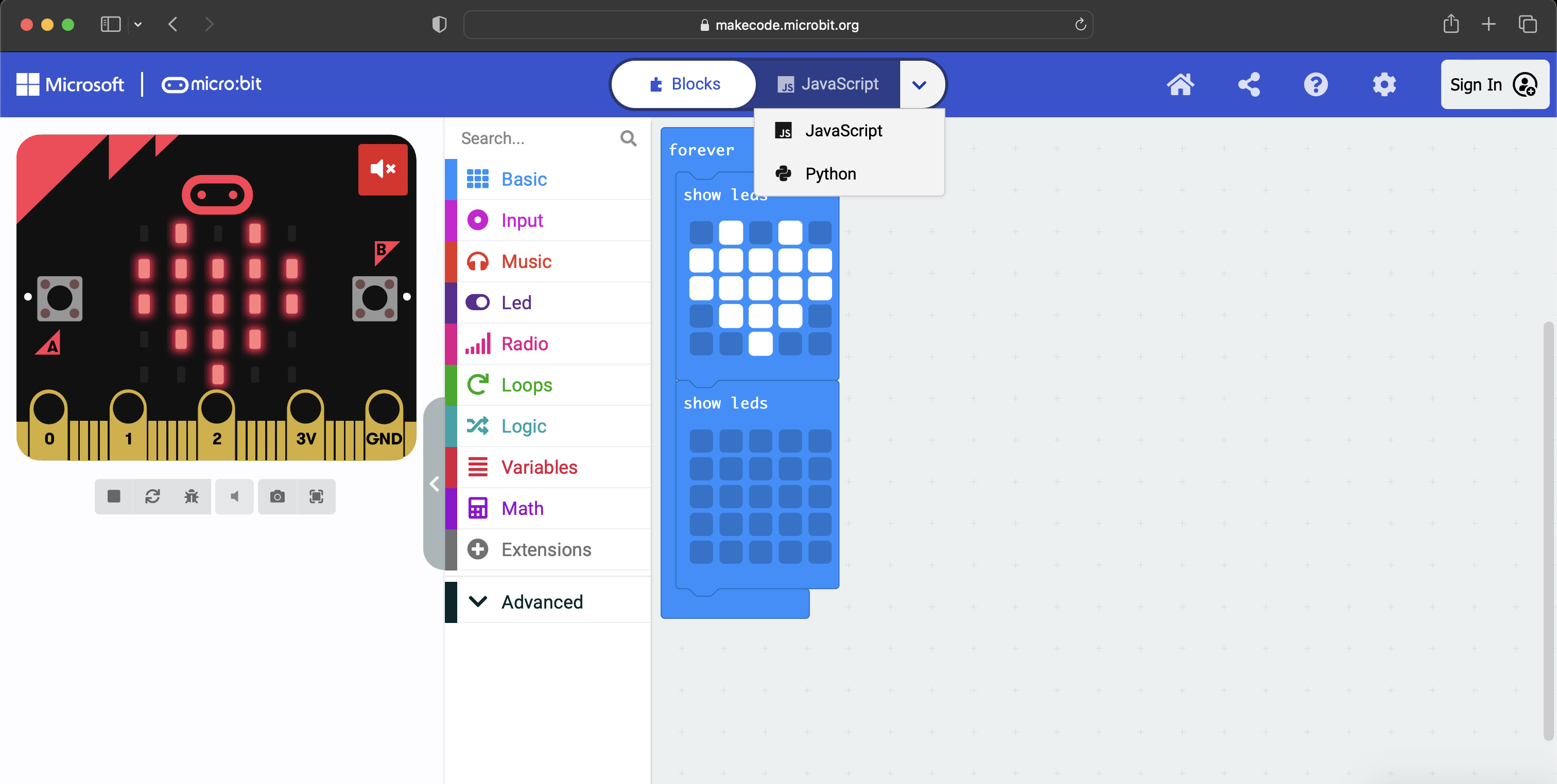 Hint (similarities): both the JavaScript and Python define a function on_forever(), of which basic.forever() invokes the function as an argument. Additionally, the graphics are displayed by calling a function on “basic”: basic.showLeds(...) for the JavaScript and basic.show_leds(...) for the Python.